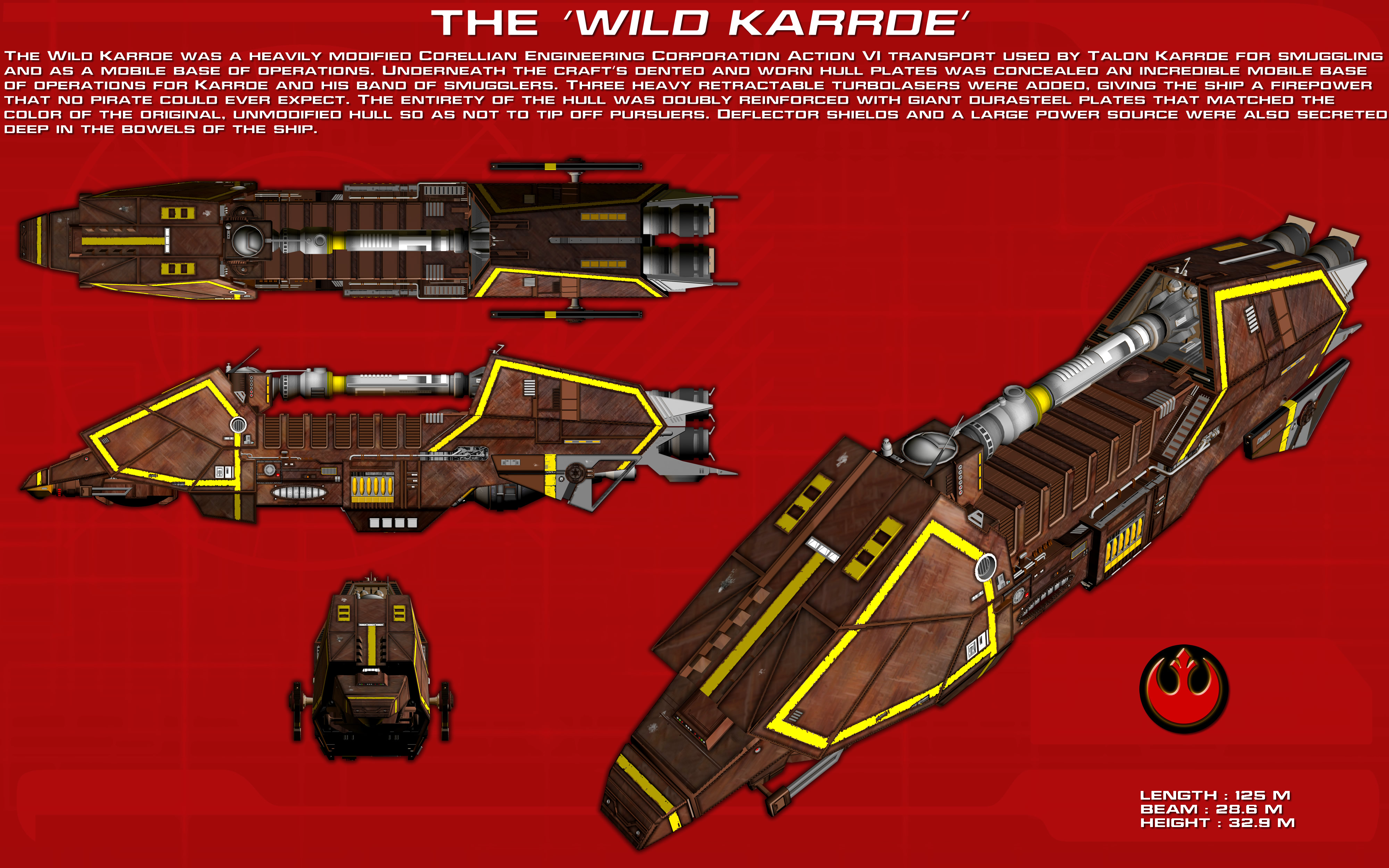 Ну, а главное отличие от братьев по цеху - оружие. С виду безобидный, "Дикий Каррдэ" имеет арсенал, состоящий из трех тяжелых турболазеров, предназначенных для сражений с крупными кораблями. Корпус бронирован значительно лучше (он стал в два раза крепче), а защитные поля сильнее в три раза, чем у обычного "Action 6". В результате данный корабль столь же крепок, как имперский фрегат, который, кстати, в два раза длиннее. Для того чтобы сбить с толку возможных преследователей, весь корпус был усилен огромными двойными дюрасталевыми листами, которые совпадали с цветом самого корпуса корабля.